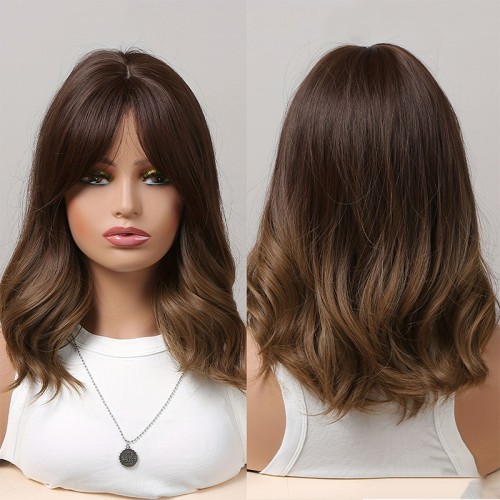This wig is crafted from high-quality heat-resistant synthetic fibers, offering a soft and smooth texture that is durable and can withstand mild heat styling. Featuring a medium-length wavy layered design, it boasts natural, full curls paired with a neat fringe. The distinct layers create a smooth, flowing appearance. The gradient brown-gold color scheme features natural transitions, enhancing visual depth and dimension. Suitable for everyday wear, parties, cosplay, and various occasions. The wig features a lace-free, machine-woven cap with a one-size-fits-all design. Its rose-net construction ensures comfortable and secure wear.