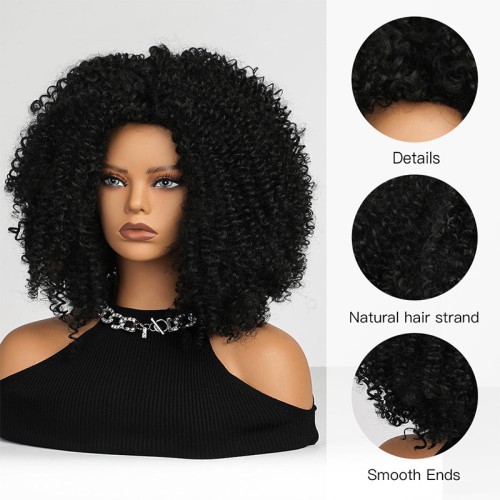 This wig features high-quality heat-resistant synthetic fibers that feel soft and smooth to the touch, offering excellent heat tolerance and durability. Its medium-length design showcases voluminous, natural-looking curls and waves, complemented by lightweight bangs for a dynamic, dimensional effect. The classic black color suits various everyday styles or special occasions. The lace-free, machine-woven cap design provides a one-size-fits-most fit, ensuring comfortable, secure wear and easy handling.