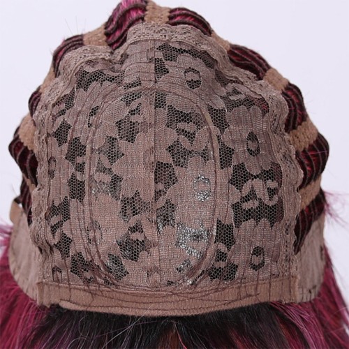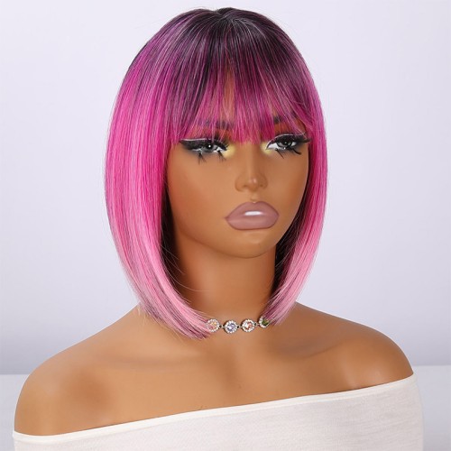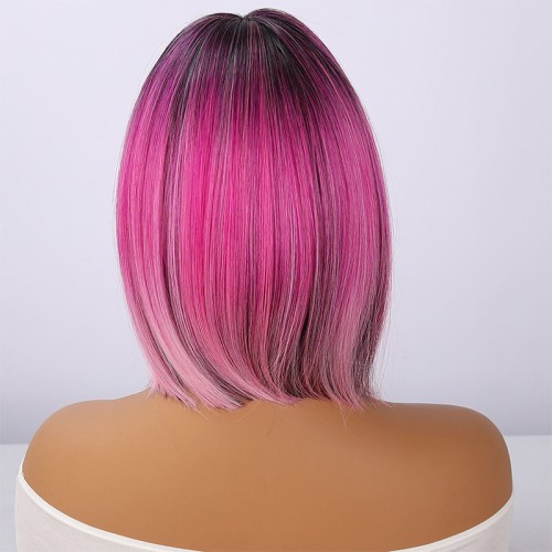 This wig features high-temperature synthetic fibers that feel soft and natural to the touch, offering heat resistance and styling flexibility. The overall design showcases dark roots fading into pink-layered short hair, with straight strands and bangs for a natural look. Constructed with a lace-free cap and rose mesh lining, it offers a one-size-fits-all design for comfortable, secure wear. With 150% density for full volume, it's perfect for daily wear, parties, and cosplay.