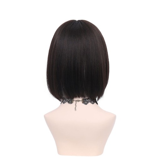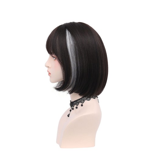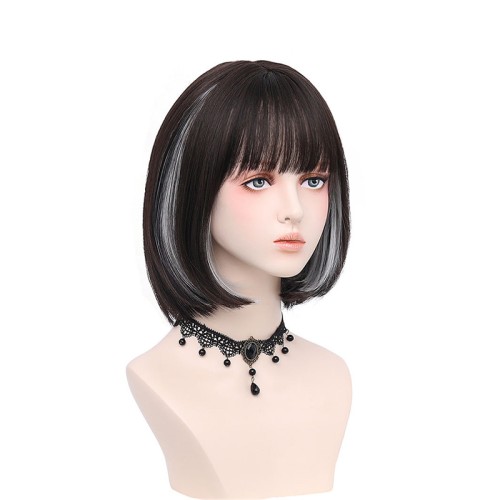 This wig features high-temperature synthetic fibers that feel soft to the touch, withstand heat styling, and hold long-lasting, natural-looking shapes. Designed with layered short hair in black roots fading to silver-gray, paired with a straight fringe, it creates a cute and trendy bob style. The machine-woven lace-free cap offers a one-size-fits-all design for comfortable, secure wear. With 150% density for full volume, it's perfect for daily wear, parties, and cosplay.