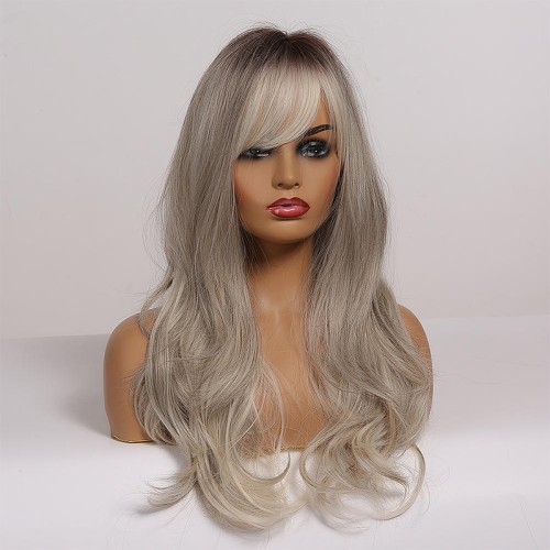 This wig is crafted from high-quality soft heat-resistant fibers, offering a smooth texture and exceptional heat tolerance. It can withstand styling temperatures up to 180°C and is suitable for both perming and dyeing. The style features a regular wave pattern with medium length, bangs, and naturally voluminous curls. Its soft, dimensional lines create an organic look. The color transitions from deep gray to ash white, offering rich layers and a distinctive visual effect. Designed without a lace cap, this one-size-fits-most wig weighs approximately 300 grams for comfortable, secure wear. Ideal for everyday styling, photo shoots, and stage performances.